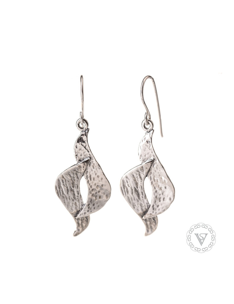 Minimalistické stříbrné náušnice tvořené dvěma tepanými na sebe napojenými dílky.