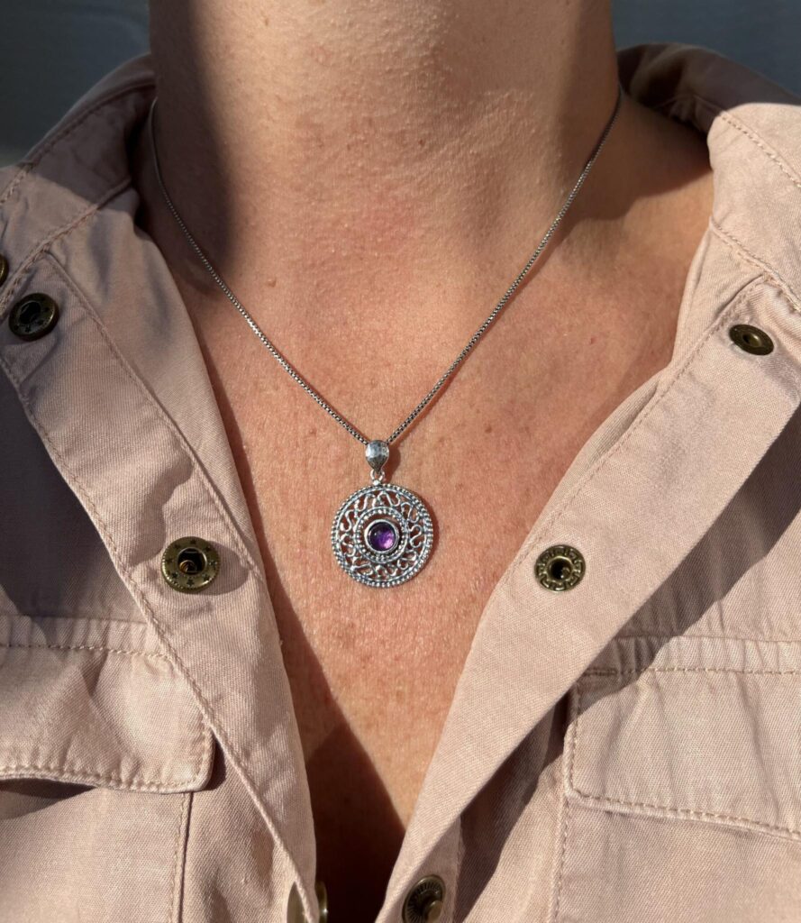 Stříbrný pevný řetízek zdobený krásným kulatým přívěskem. Uprostřed přívěsku je vsazený kulatý kamínek. Přívěsek je zdobený jemnými ornamenty a je perforovaný.