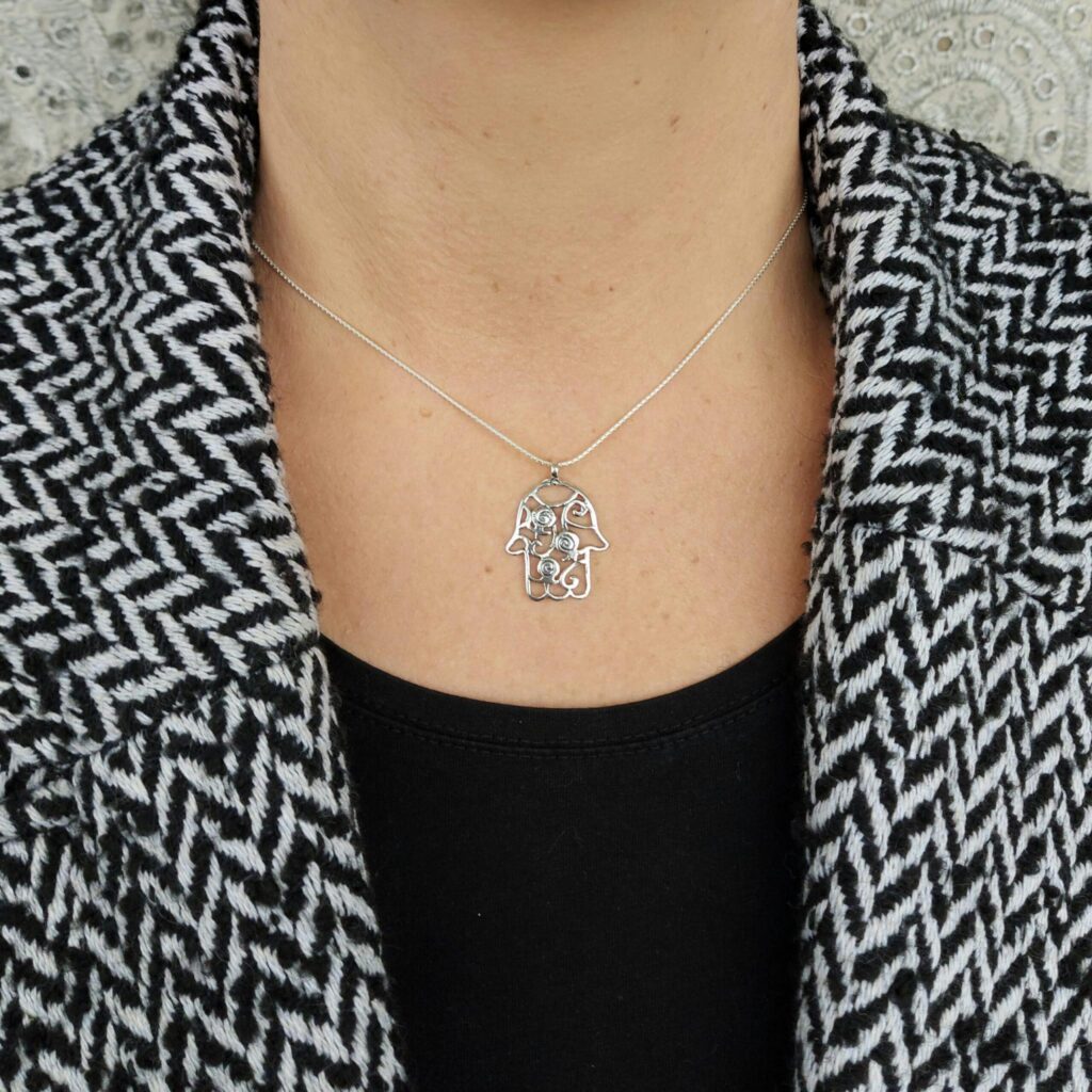 Stříbrný řetízek s přívěskem ve tvaru chamsy. Chamsa na přívěsku je perforovaná a zdobená spirálkami připomínajícími květy.