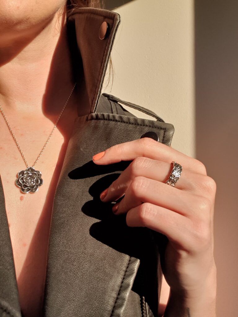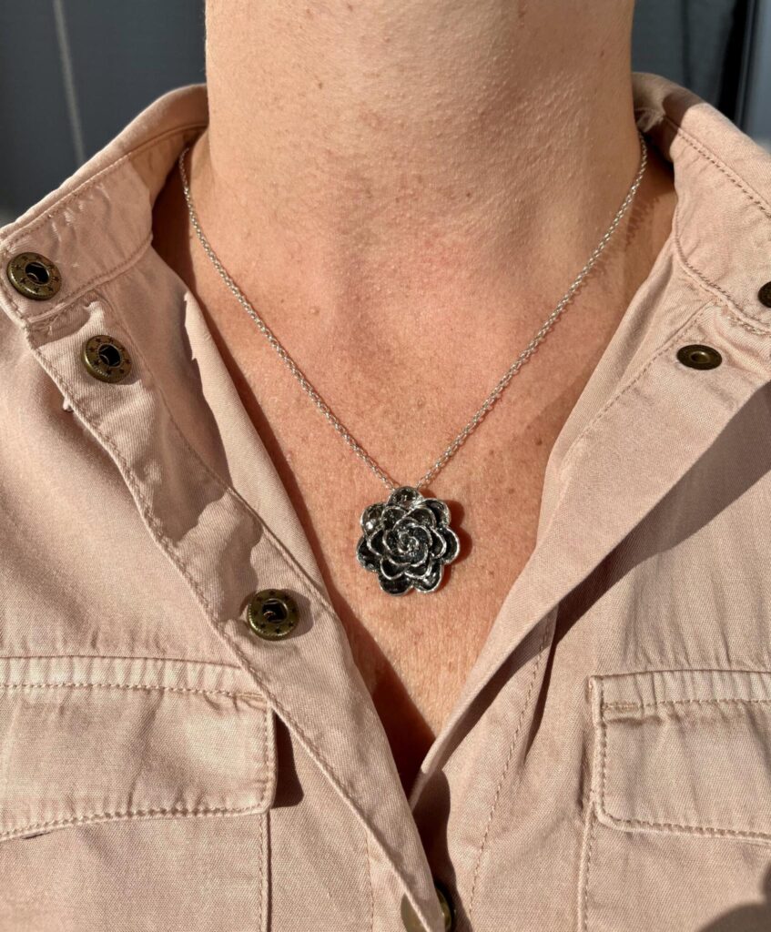 Stříbrný náhrdelník s výrazným přívěskem ve tvaru do detailu propracovaného květu.