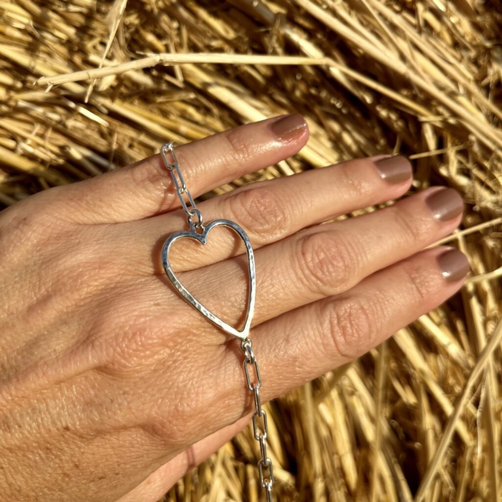 Stříbrný minimalistický náramek, který tvoří řetízek s většími oválnými očky. Náramek je uprostřed zdobený srdíčkem.