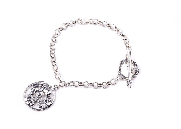 Stříbrný náramek tvořený hrubším řetízkem a kulatým přívěskem s reliéfem kytičky. Kytička je uprostřed zdobená kamínkem.