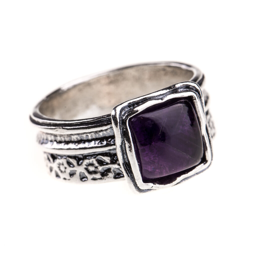 Krásný stříbrný prsten zdobený jedním čtvercovým kamenem. Kámen je vsazený do čtvercového rámečku. Kroužek prstenu je v jedné polovině jemně dekorovaný rostlinnými motivy, druhou polovinu zdobí dva jemné kroužky. Uvnitř je prsten hladký. Uvnitř prstenu je drobný nápis ISRAEL.